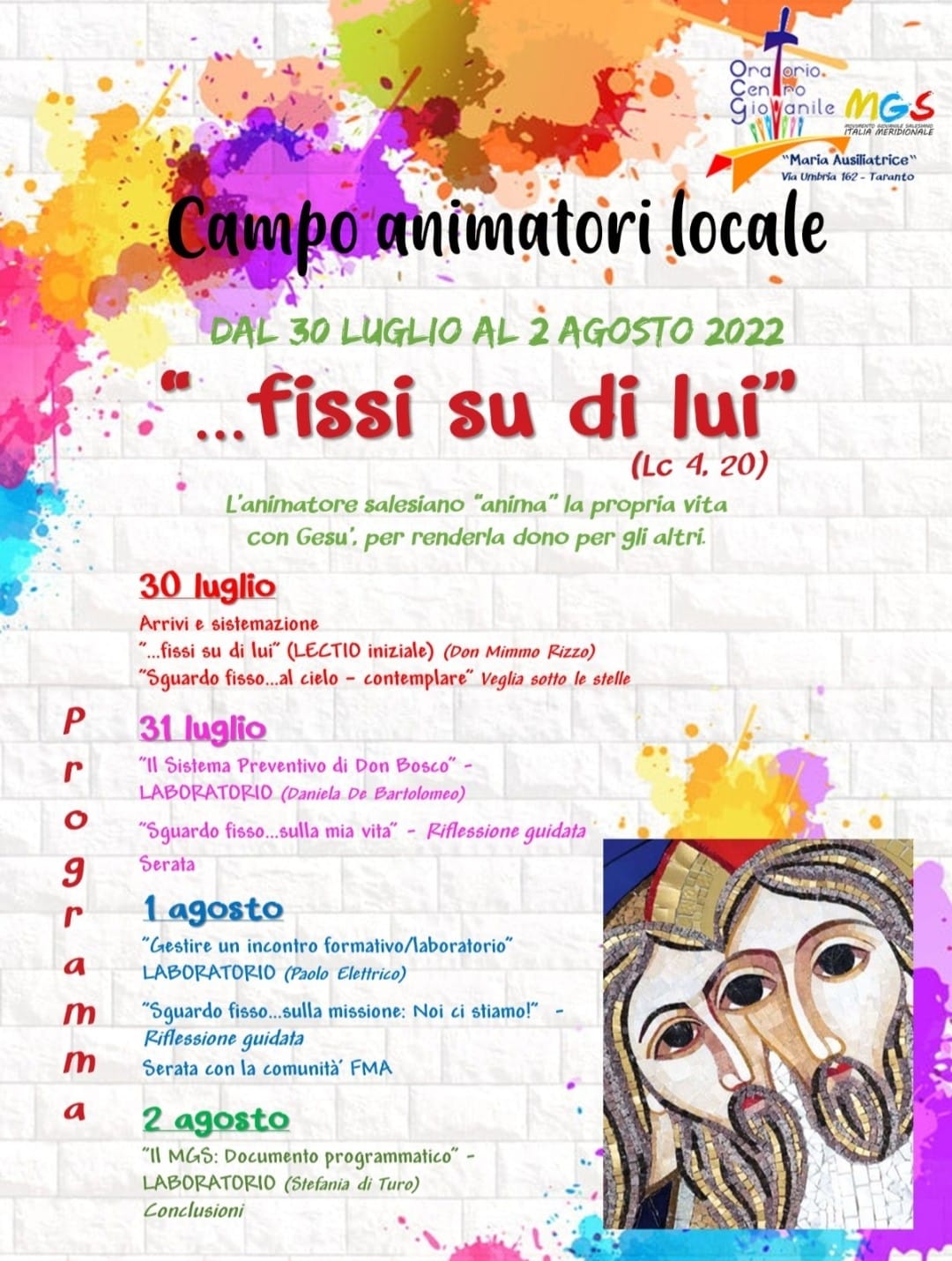 Con gli occhi “…fissi su di lui” (Lc 4, 21). È il tema del campo animatori locale che si è tenuto dal 30 luglio al 2 agosto all’oratorio “Maria Ausiliatrice” di Taranto. Non avendo animatori dell’età giusta per partecipare al campo Ispettoriale per animatori, abbiamo pensato di organizzarne uno locale per dare comunque un’opportunità formativa, di aggregazione e di riflessione agli animatori dell’oratorio. Dodici i destinatari. L’età dai 14 ai 16 anni.