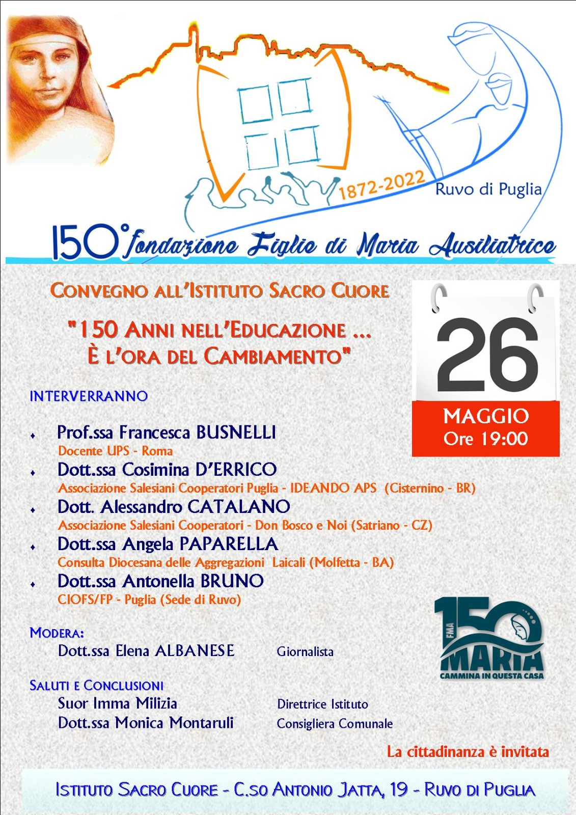 la tavola rotonda di giovedì 26 maggio alle 19 nell’Auditorium dell’Istituto Sacro Cuore, dal titolo “150 anni nell’educazione … è l’ora del cambiamento”.