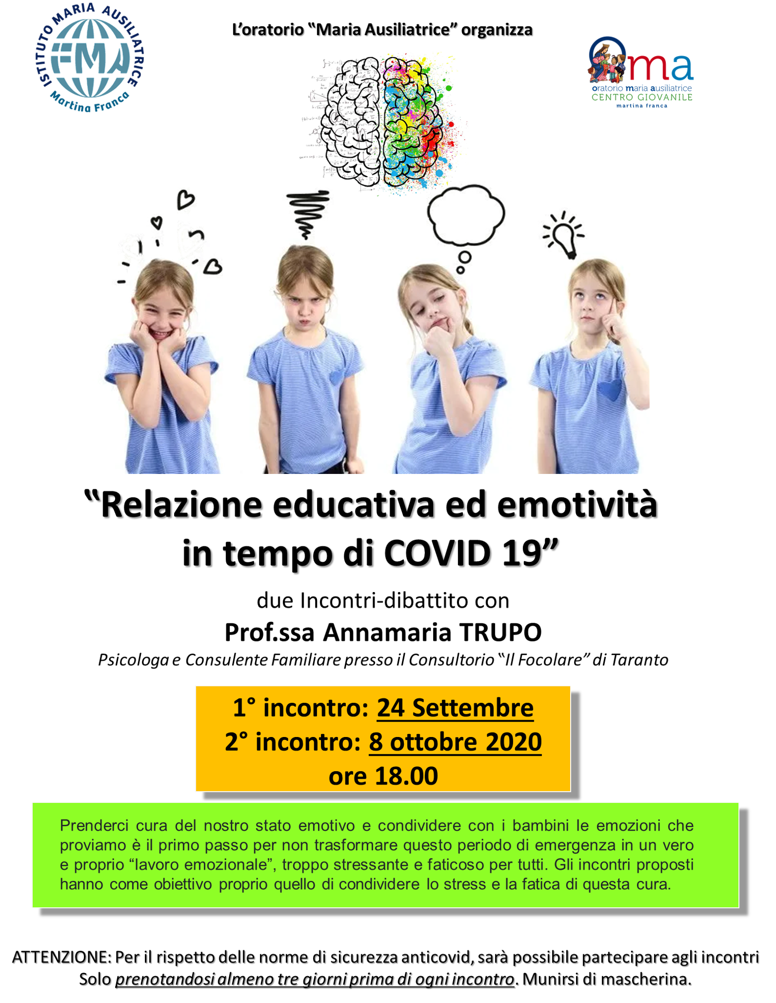 Si è pensato di organizzare due incontri iniziali, il 24 settembre e l’8 ottobre, dal tema “Relazione educativa ed emotività in tempo di Covid-19”. Entrambi i momenti sono stati tenuti dalla dott.ssa Annamaria Trupo, psicologa e Consulente Familiare presso il consultorio “Il Focolare” di Taranto.