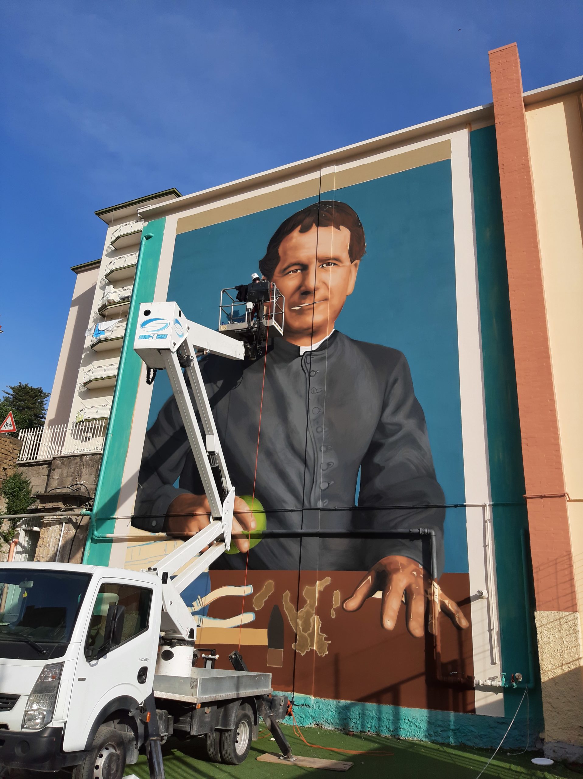 A partire dalla notte del 24 maggio, linea dopo linea, sfumatura dopo sfumatura, emerge dalla facciata dell’ Istituto Vincenzo D’Amato di Gragnano,  il volto, sempre più vivido, di Don Giovanni Bosco. A dipingerlo, con singolare maestria, è la mano della street artist Leticia Mandragora, già firma di altri due meravigliosi murales nella città della pasta.