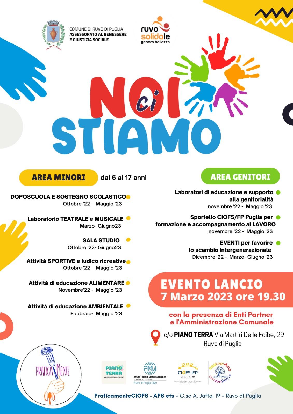 Per il progetto NOI CI STIAMO presentato da Praticamente CIOFS APS ETS saranno messe in campo, in collaborazione con gli altri soggetti della partnership, ossia CIOFS FP PUGLIA E ETS e Istituto SACRO CUORE una serie di azioni destinate ai ragazzi e ragazze dai 6 ai 17 anni e alle famiglie.