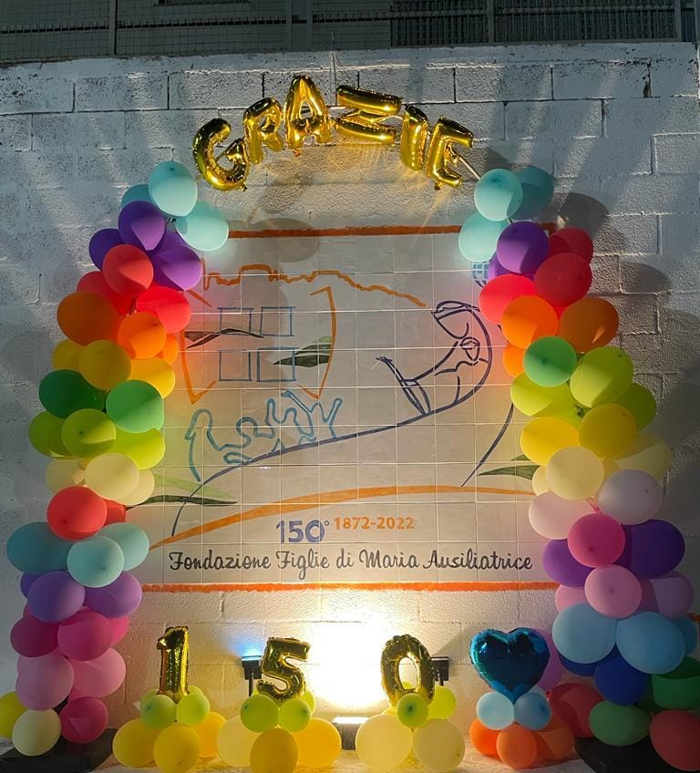 Festeggiare i 150 anni di fondazione dell’istituto delle Figlie di Maria Ausiliatrice dopo un percorso laboratoriale che ha visto la progettazione e realizzazione di ogni singola mattonella di un grande mosaico commemorativo, ha avuto un sapore assolutamente speciale. Il percorso laboratoriale di due settimane, inserito nell’Estate Ragazzi 2022, è stato guidato da Sabrina Vendola, ceramista exallieva del CiofsFp di Ruvo di Puglia e realizzato grazie all’impegno e alla passione di una quindicina di adolescenti e preadolescenti dell’oratorio.  Dopo aver eseguito le varie fasi della realizzazione delle singole mattonelle, è stato necessario anche l’intervento di un esperto piastrellista per essere sicuri che il fissaggio sulla parete del cortile, duri per i prossimi 150 anni. Dopo l’inaugurazione del mosaico e del murales (anch’esso a tema 150mo) fatta durante la festa finale di Estate Ragazzi, alla presenza dei genitori e collaboratori e dell’assessore al Welfare dott. Domenico Savio Curci, abbiamo voluto la benedizione da parte del Vescovo, al termine della celebrazione Eucaristica del 5 agosto. Tutta la comunità educante di Ruvo di Puglia ha vissuto un momento intenso in Cattedrale, con il ricordo della prima professione di Main e delle prime sorelle, resa presente dalla rinnovazione dei voti da parte di tutte le FMA presenti. Al termine tutta l’assemblea si è trasferita presso il cortile dell’oratorio dove l’inno del 150mo ballato da animatori e adolescenti ha aperto il momento celebrativo. Erano presenti, col Vescovo Mons. Domenico Cornacchia, diversi parroci della città, seminaristi, oltre che il sindaco Prof Pasquale Chieco e l’assessore al Welfare Curci. Tutti gli altri assessori e consiglieri si erano resi presenti con messaggi di augurio e di saluto. Alla benedizione del Vescovo è seguito il taglio della torta del 150mo, lo scoppio di palloncini e coriandoli, un brindisi ai prossimi 150 anni di vita e di generativita’ vocazionale in una città che tanto ha donato negli anni in vocazioni alla vita  religiosa salesiana. Non potevano mancare i saluti, visto il cambio della comunità FMA. Il Vescovo ha augurato che il passaggio del testimone da suor Imma a suor Liberata sia nel segno di una piena continuità. Il sindaco, che per un po’ di umiltà non era stato invitato alla cerimonia, ha preso la parola per dichiarare di aver voluto partecipare a questo momento così speciale per esprimere il grazie dell’amministrazione comunale per il lavoro fatto in sinergia con il territorio, per l’impegno e l’apporto specifico dato dalla comunità educante dell’istituto nel percorso di costruzione di un grande sogno di tutta l’amministrazione: la realizzazione di una Comunità Educante cittadina, grazie al lavoro di rete di tutte le associazioni ed agenzie educative. La direttrice ringrazia il sindaco per le sue parole e soprattutto per la sua presenza e assicura che la Comunità Educante di Ruvo, con l’apporto specifico del CiofsFp e dell’oratorio, oltre che dei membri della Famiglia Salesiana, continuerà ad essere una vera e propria palestra in cui ci si possa tenere sempre in allenamento per la costruzione del sogno di Ruvo Città Educante. Tra i presenti, tutta l’equipe del CiofsFp, compresi tanti docenti con le loro famiglie, il Consiglio Oratoriano e tutta la Famiglia Salesiana, che hanno applaudito confermando l’impegno assunto da sr Imma a nome di tutti. Dopo le foto di rito ancora musica e festa sulle note dell’inno del 150mo, un vero e proprio tormentone estivo, che oratoriani ed animatori si porteranno per sempre nelle orecchie e nel cuore, a ricordo di queste celebrazioni straordinarie, in sintonia con la festa di tutto il mondo FMA, da Mornese a tutti i cinque continenti.